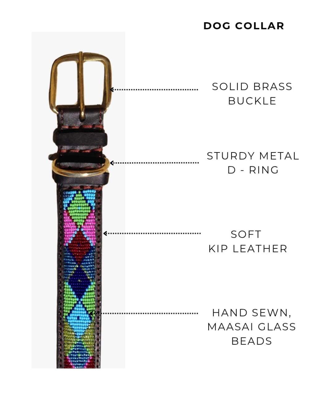 Featuring intricate beadwork with vibrant Czech glass beads, this dog collar honors the evolution of Masai craftsmanship. Stylish, durable, and symbolic.
